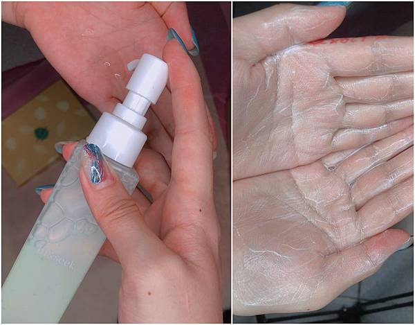 剛擠出來時是非常濃稠的凝膠狀,跟一般洗面乳不大一樣,味道是清淡的花香